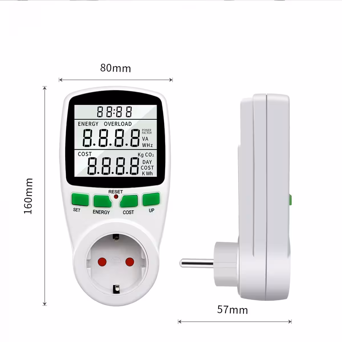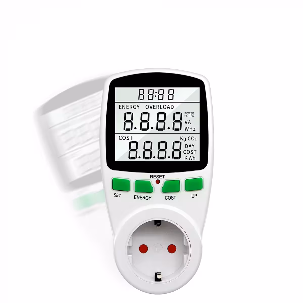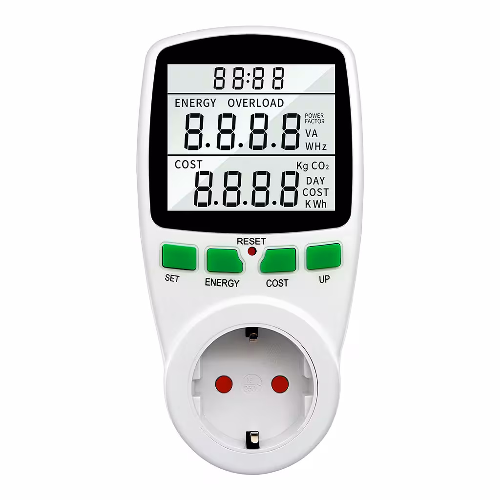 Tämä wattimittari mahdollistaa tarkat sähköparametrien mittaukset kaikille pistorasiaan liitetyille laitteille. Seuraa kodin tai toimiston laitteiden todellista sähkönkulutusta kustannusten optimointia varten.