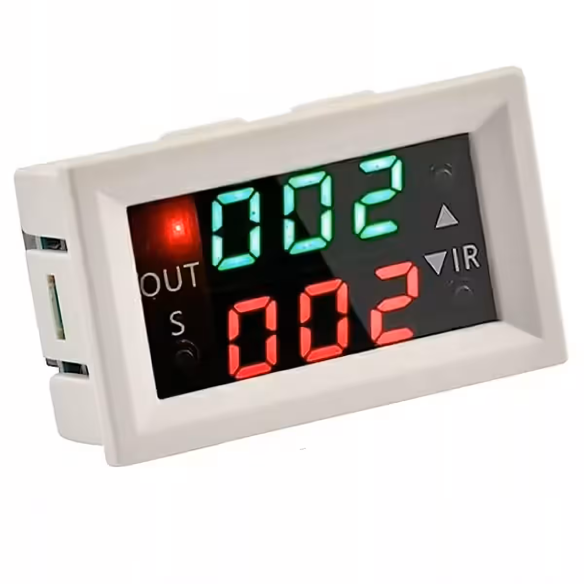 12V aikarelemoduuli on monitoiminen elektroninen laite, joka sopii erinomaisesti automaatiosovelluksiin, ohjattuun virransyöttöön, DIY-järjestelmiin ja elektronisiin projekteihin. Tämä moduuli mahdollistaa tarkat asetukset kahdelle ajanjaksolle (Aika 1 ja Aika 2), jotka näkyvät kaksois-LED-näytöllä – vihreä ja punainen.