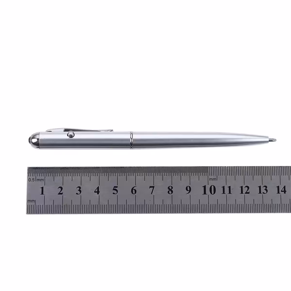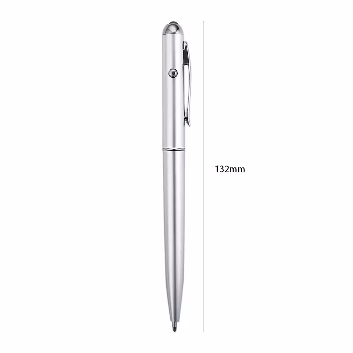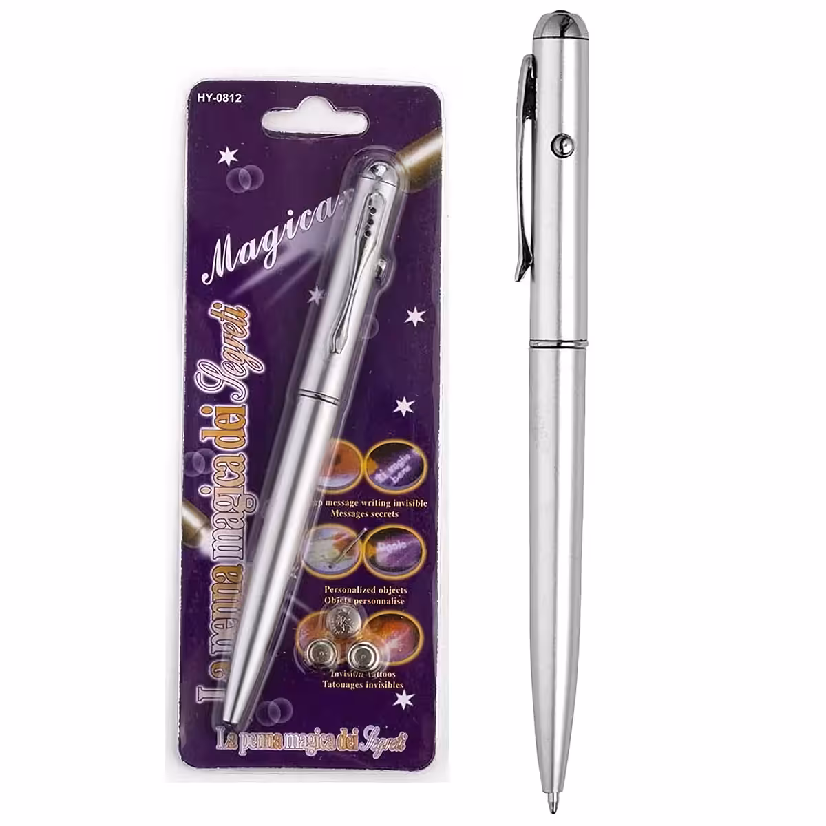 Tämä näkymättömällä musteella varustettu kynä on ihanteellinen salaisiin muistiinpanoihin, rahan merkitsemiseen, esineiden personointiin tai väärennösten havaitsemiseen. Muste ei näy normaalissa valossa, mutta muuttuu täysin luettavaksi ultraviolettivalossa, jota integroitu UV-LED -lamppu kynän kärjessä tuottaa.