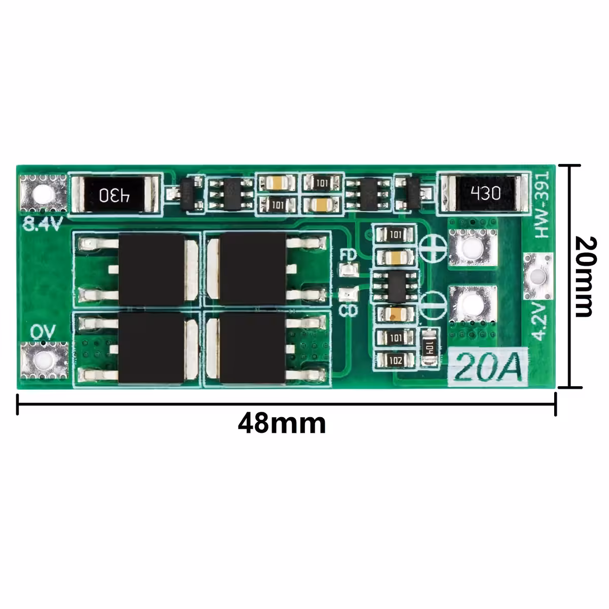 Setti 2 kpl × BMS 2S 20A — Tasapainotettu versio (48×20×3,4mm), täydellinen 7,4V Li-Ion -paketeille, tarjoaa edistyneen suojan ja tasapainotuksen.