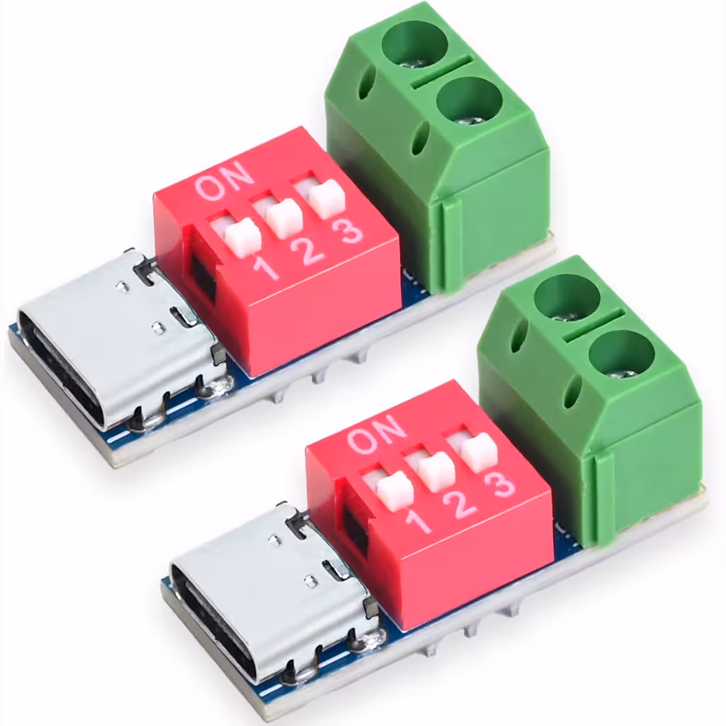 Tämä 2 moduulin Type-C PD QC Trigger -setti on suunniteltu pyytämään kiinteitä jännitteitä yhteensopivilta USB-C -latureilta, jotka tukevat PD3.0 / PD2.0 / QC / BC1.2. Se on ihanteellinen DIY-projekteihin, elektronisten laitteiden testaukseen, virtalähteiden käyttöön ja prototyyppeihin.
